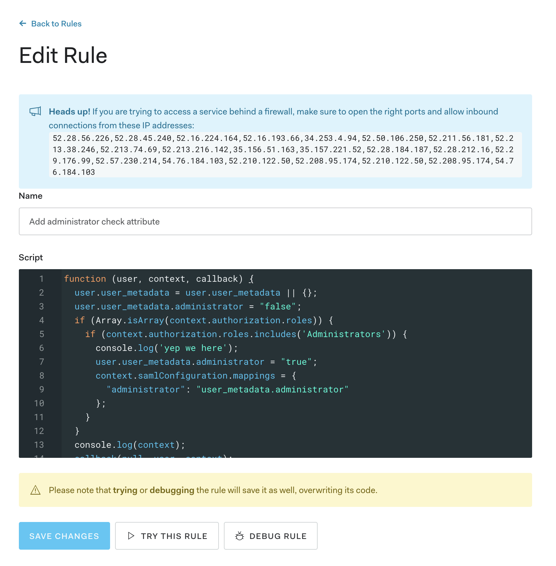 function (user, context, callback) { user.user_metadata = user.user_metadata || {}; // Default the administrator flag to false we will use this flag // as the input to our SAML assertion attribute user.user_metadata.administrator = "false"; // We need to make sure that the roles property is passed and that it is // an array if (Array.isArray(context.authorization.roles)) { // If the string 'Administrators' which is the name of the role // is included in the array then this user has the Administrator role assigned // to her if (context.authorization.roles.includes('Administrators')) { // Flip the flag to true. This will add the administrator // attribute to the SAML response user.user_metadata.administrator = "true"; context.samlConfiguration.mappings = { "administrator": "user_metadata.administrator" }; } } callback(null, user, context); }