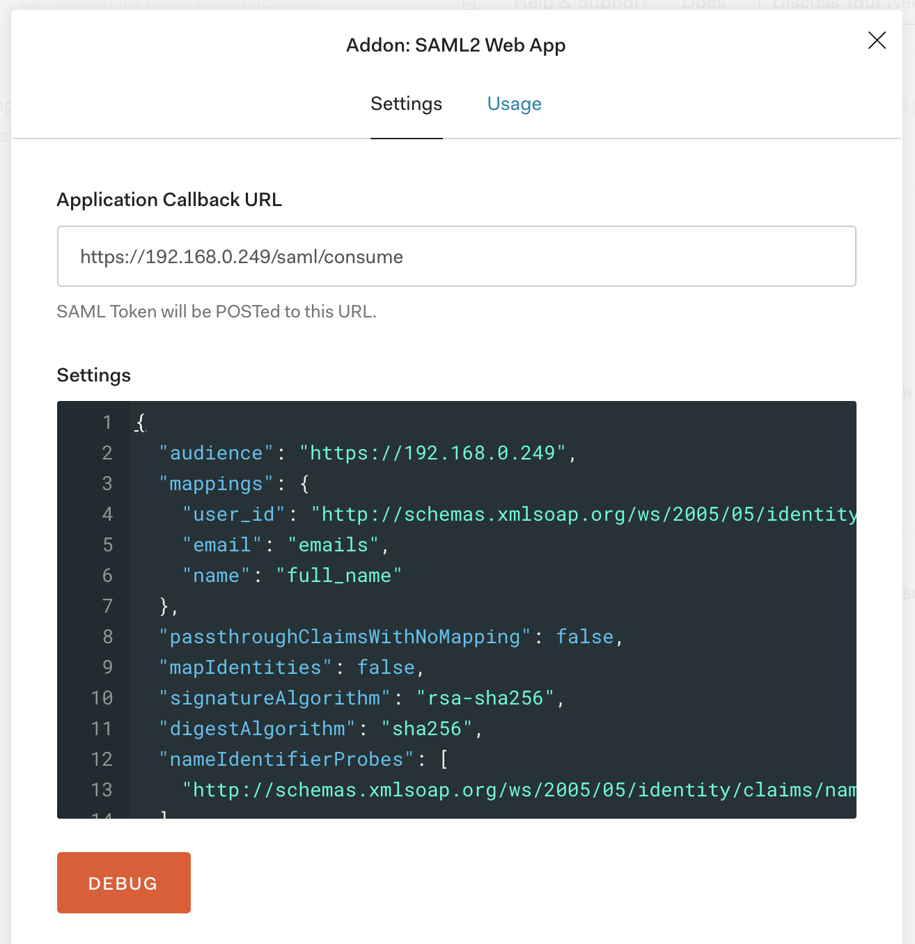 Applicationand enableSAML 2.0addon in theAddonssection by following this guide# Same configuration as provided in the reference in step #1 { "audience": "https://<GITHUB_ENTERPRISE_SERVER_HOSTNAME_OR_IP>", "mappings": { "user_id": "http://schemas.xmlsoap.org/ws/2005/05/identity/claims/nameidentifier", "email": "emails", "name": "full_name" }, "passthroughClaimsWithNoMapping": false, "mapIdentities": false, "signatureAlgorithm": "rsa-sha256", "digestAlgorithm": "sha256", "nameIdentifierProbes": [ "http://schemas.xmlsoap.org/ws/2005/05/identity/claims/nameidentifier" ] }